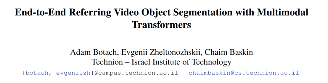 为了解决这些挑战,现有 RVOS 方法往往依赖复杂的 pipeline。在被CVPR 2022接收的一篇论文《End-to-End Referring Video Object Segmentation with Multimodal Transformers》中,来自以色列理工学院的研究者提出了一种简单的、基于Transformer的端到端RVOS方法——Multimodal Tracking Transformer(MTTR )。