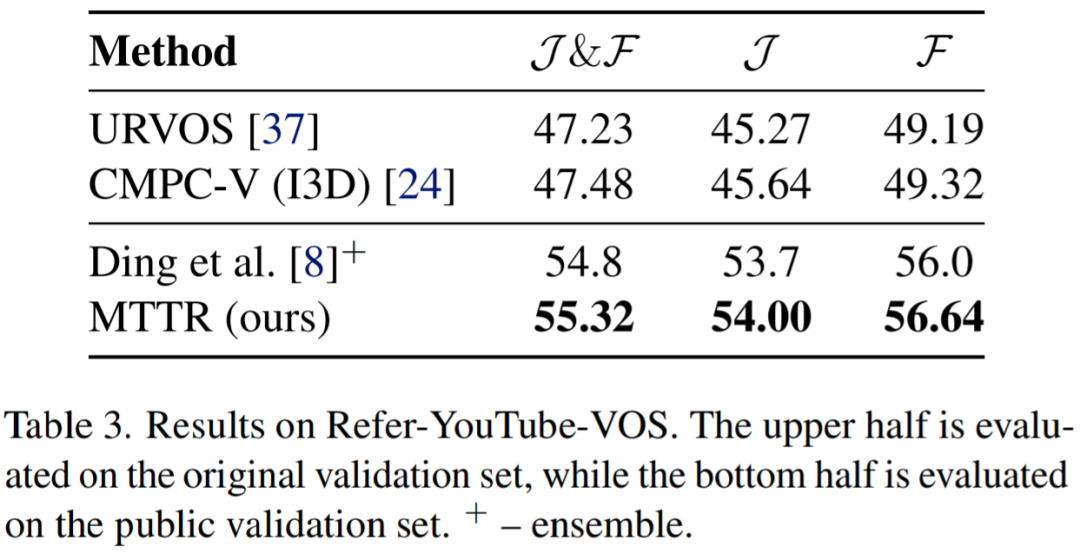 表3报告了在Refer-YouTube-VOS公共验证集上的结果。与现有方法[24,37]相比,这些方法是在完整数据集上进行训练和评估的,尽管该研究模型在较少的数据上进行训练,并专门在一个更具挑战性的子集上进行评估,但MTTR在所有指标上都表现出了卓越的性能。