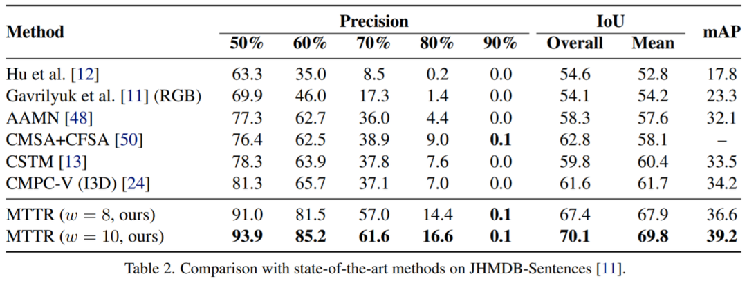 按照之前的方法 [11, 24],该研究通过在没有微调的 JHMDBSentences 上评估模型的泛化能力。该研究从每个视频中统一采样三帧,并在这些帧上评估模型。如表2所示,MTTR方法具有很好的泛化性并且优于所有现有方法。