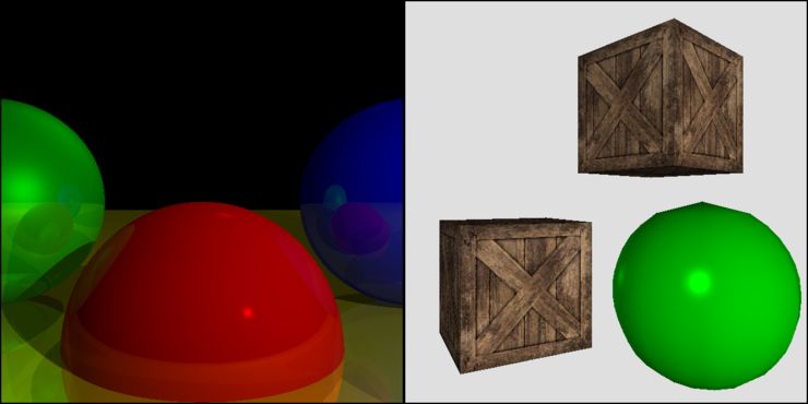 跟着书本学习,最后的「最终结果」是两个完整的、功能齐全的渲染器:一个光线追踪器和一个光栅化器。尽管它们采用的是非常不同的方法,但在用于渲染简单场景时,它们会产生类似的结果: