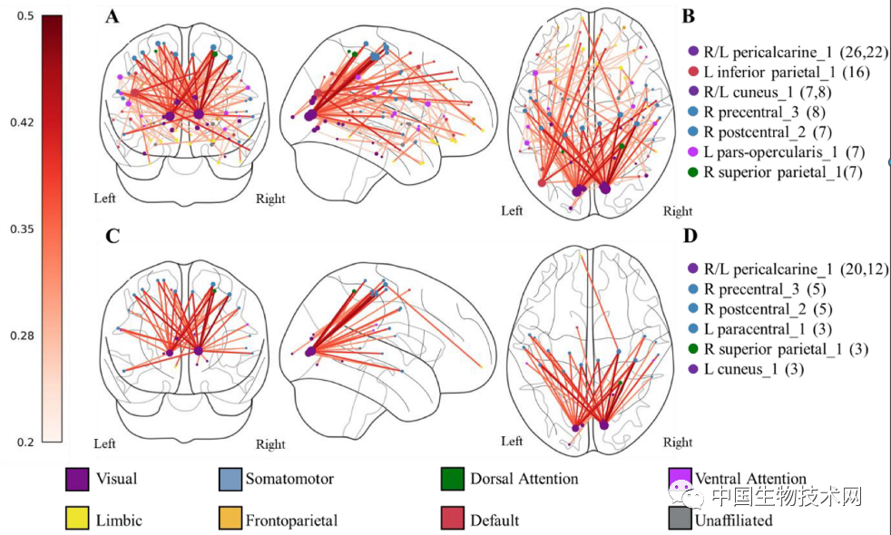 此外,大脑的距状沟,即初级视觉皮层的解剖位置,是这个子网络中最活跃的节点。