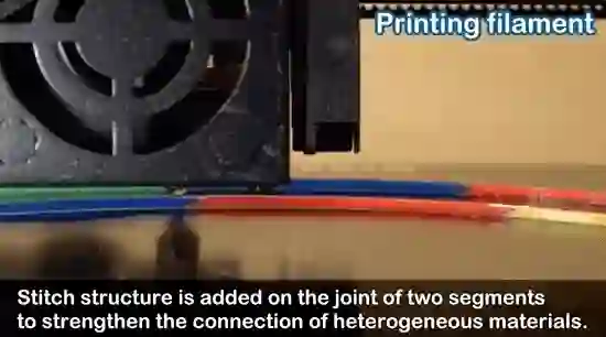 这个过程包括两个步骤:创建长丝和打印部件。实际上,部件的打印过程相当枯燥,和打印普通的部件过程没有什么区别,唯一不同的是,完成打印后,部件不同的地方有着不同的材料,研究人员需要将这些材料预先编程到长丝中的,并准确地指明它们所在的位置和长度。
