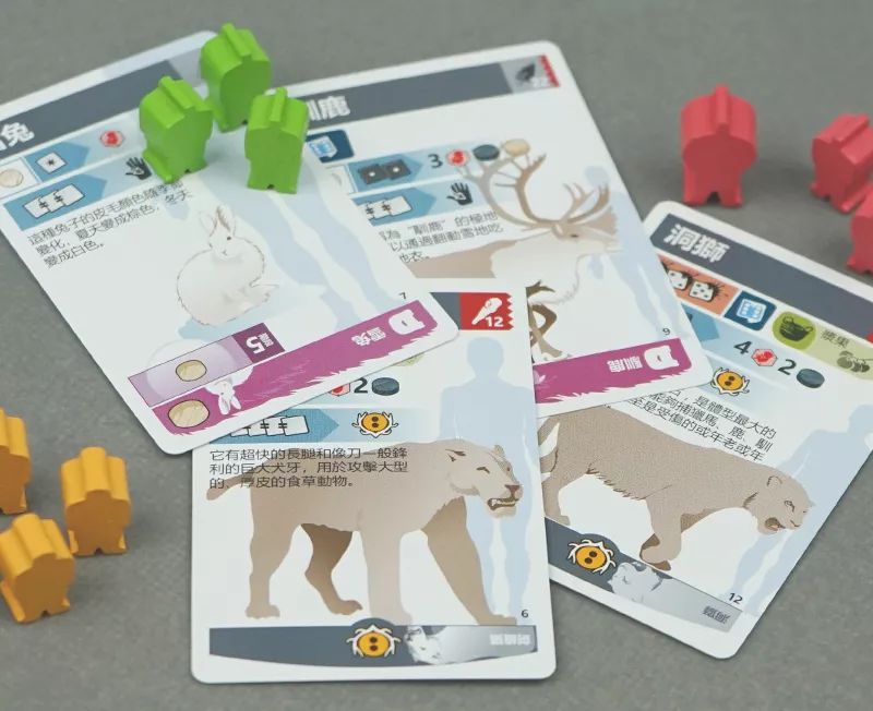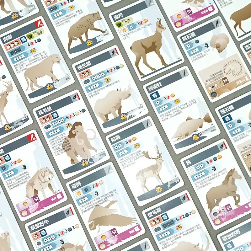 《尼安德特人》里可狩猎的种群卡基本囊括了当时常见的动物类型,既有洞狮、长毛象、披毛犀等极难狩猎但奖励丰厚的卡牌,也有燧石矿、麻绳等物资帮助你制造工具。