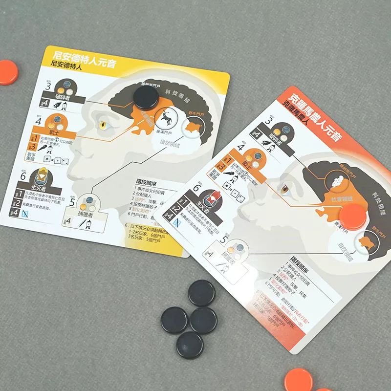 比如三种古人类里,尼安德特人身体比较强壮而且脑容量也大,他的米宝(Meeple,桌游里的小人模型)体型和脑袋就明显大了一圈。