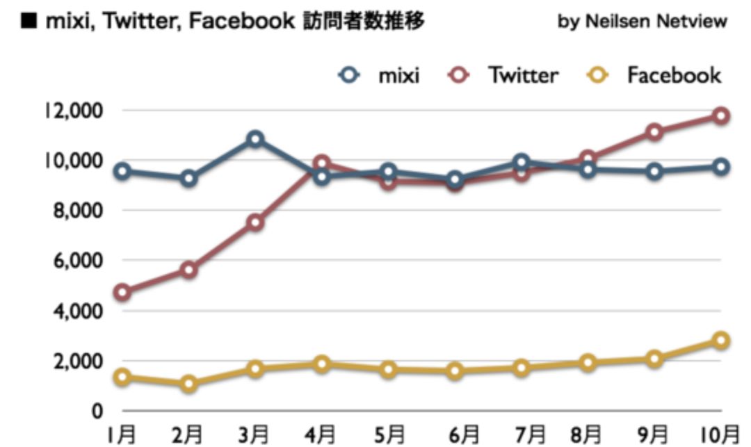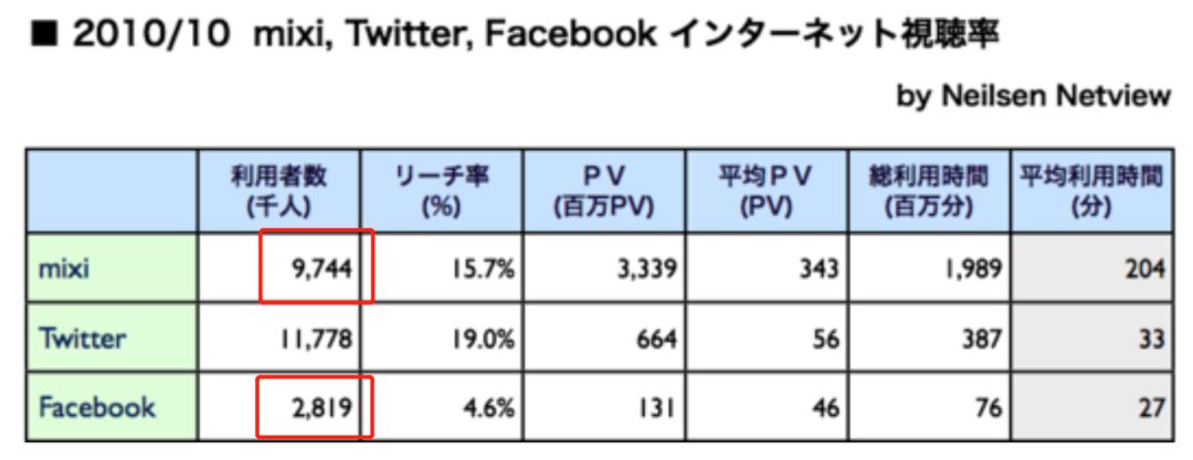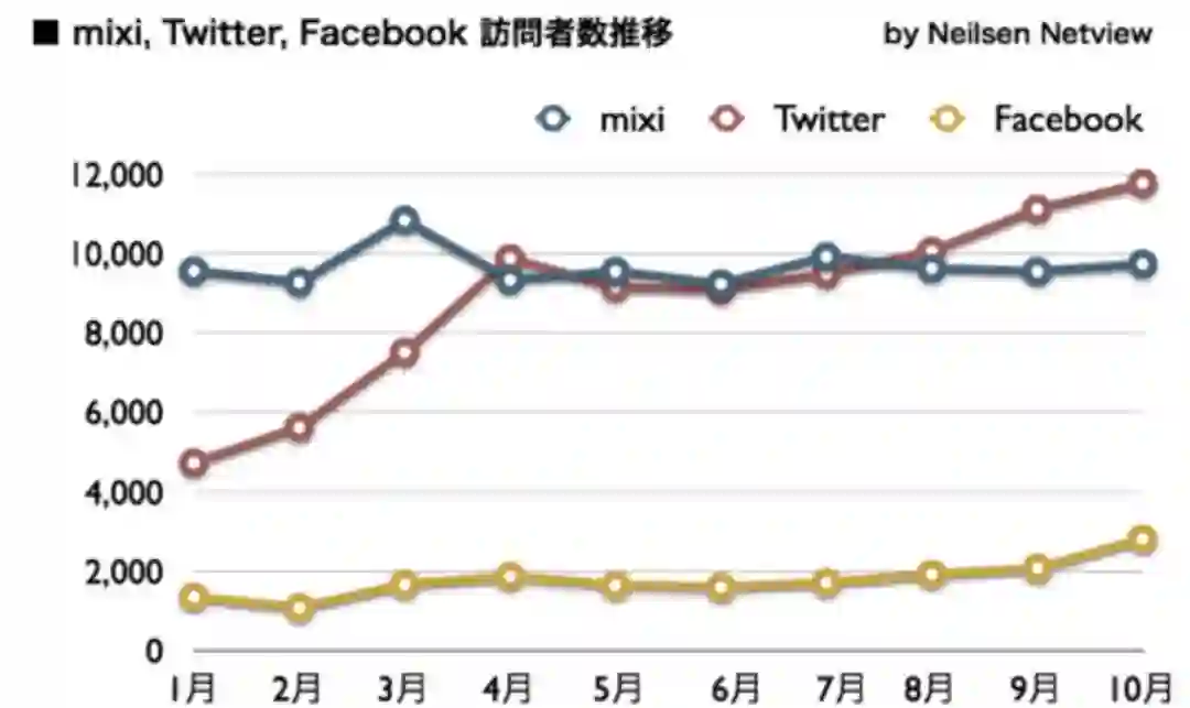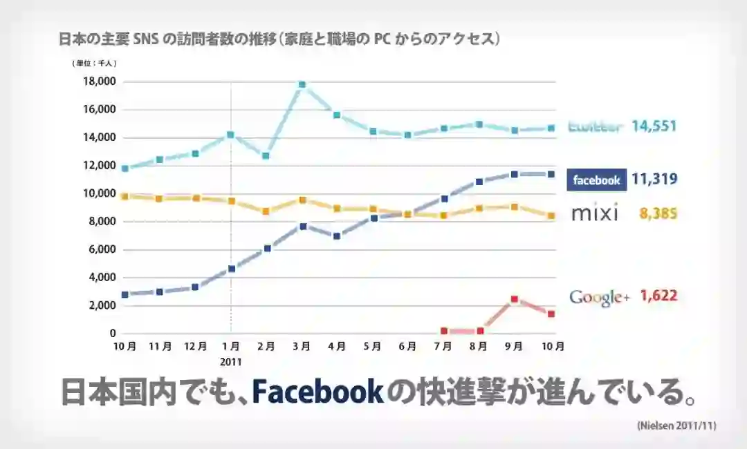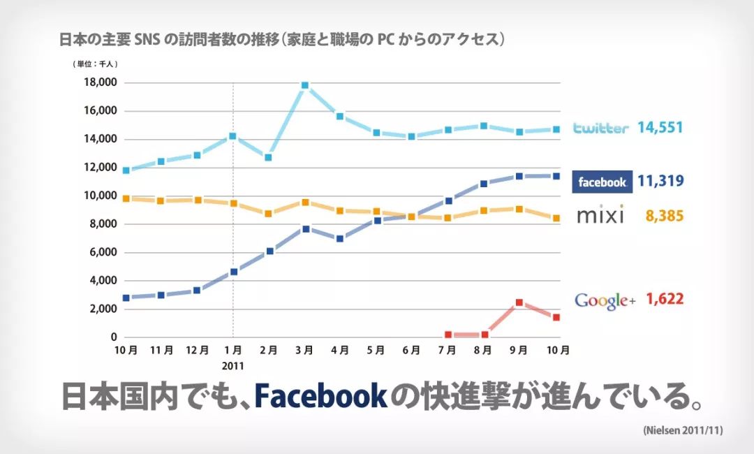 根据尼尔森数据,Facebook的用户数在2011年6月左右反超Mixi。