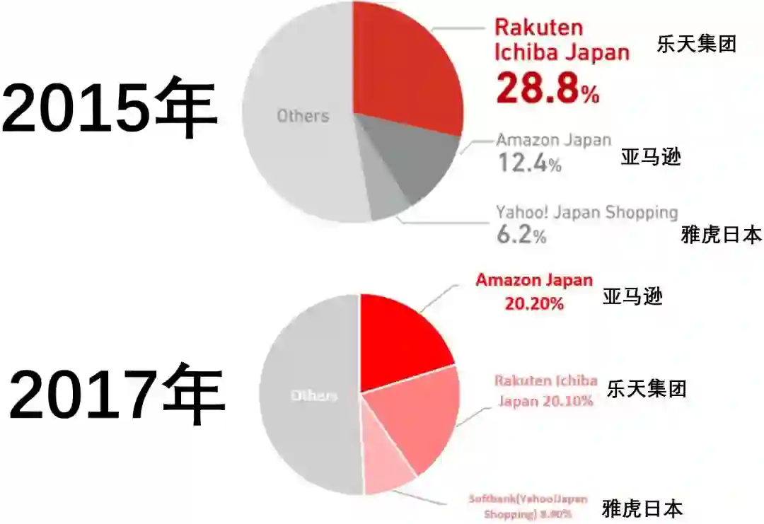 先说结论,2017年以前,日本最大的电商是本土的乐天集团,但之后第一的位置被美国的亚马逊夺走。