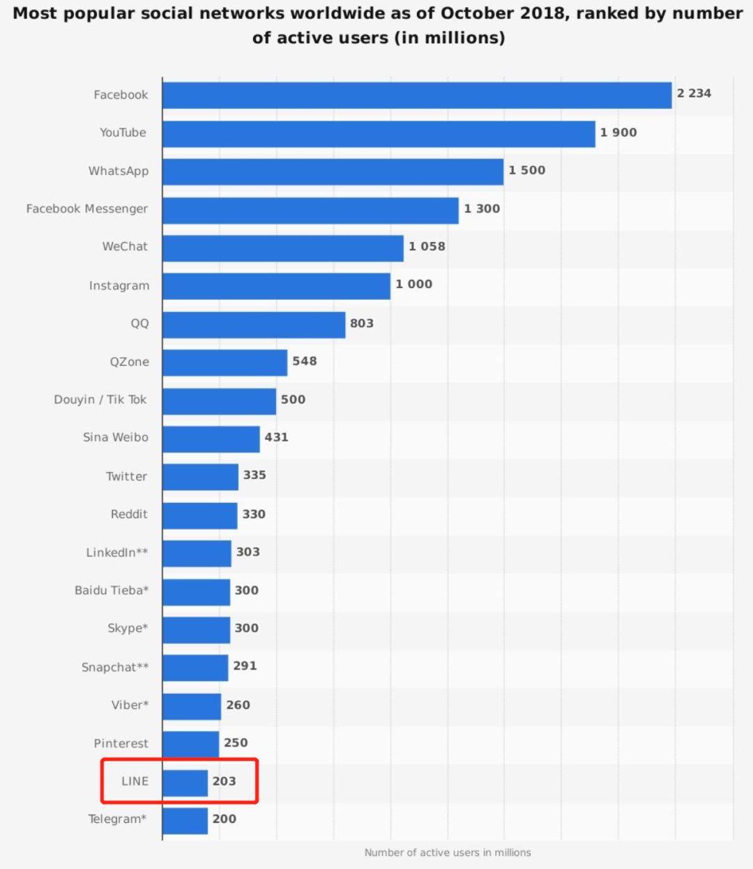 2016年7月,Line赴美上市,截止目前其市值是93亿美元,月活跃用户数在2亿左右。