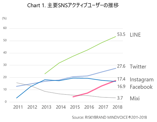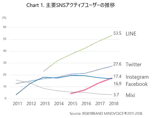 从上图可以看到,2013年Mixi、Facebook和Twitter还打得难舍难分时,Line的用户数已经超越了三者。