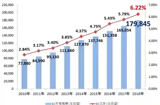 可以看到2018年日本的电商率是 6.22%,当时官方还公布了美国的电商率是 10%,而中国则超过了 15%,由此可见日本的电商是非常不发达的,