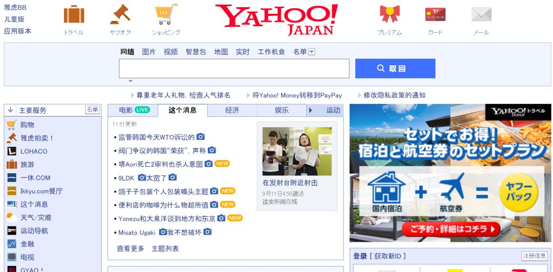 雅虎日本简洁、字体小,没有很多吸睛的图片,分类丰富。