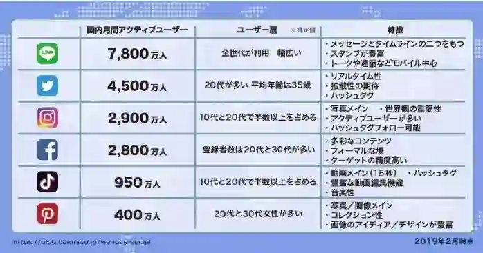 截止2019年2月,日本国内社交应用的月活跃用户数如下。