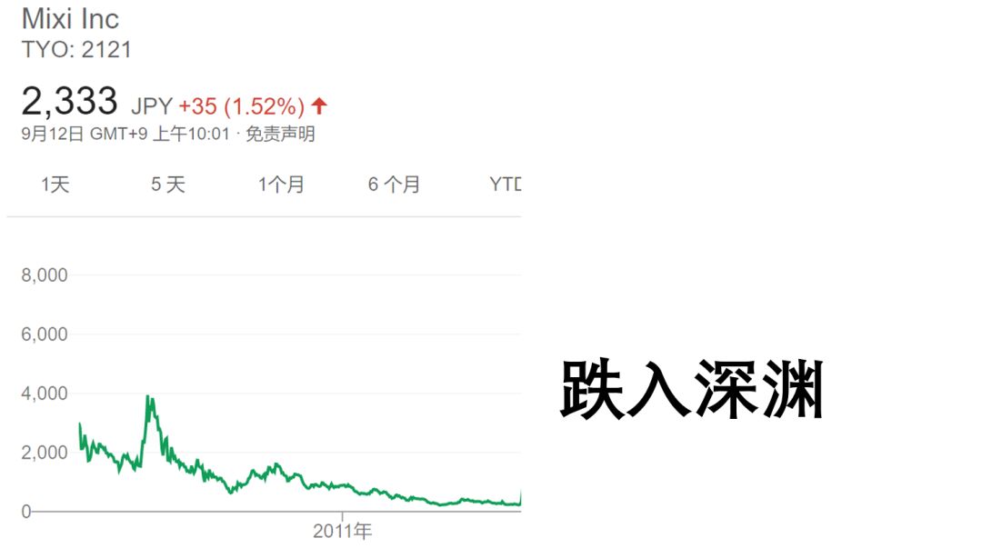 Mixi的市值也从巅峰期2007年的25亿美元,跌落到2013年11月的1.7亿美元。