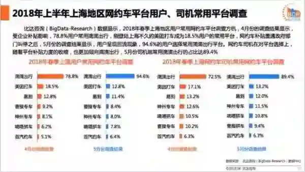 数据显示,4月份受企业补贴影响,上海用户最常用的网约车中,滴滴出行位列第一,占比78.8%,刚登陆上海不久的美团排名第二,占比18.5%,司机最常用平台滴滴出行排名第一,占比72.5%,美团紧随其后,占比17.1%。