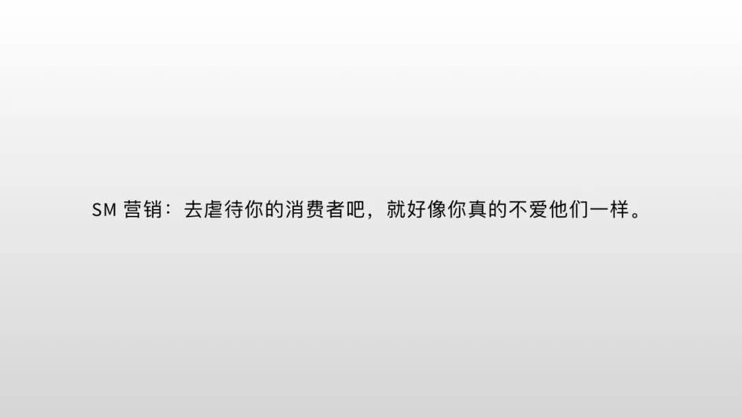 当然为了效果,我起了个比较吸引人的题目,叫 SM 营销。道理说的是什么呢?说的就是品牌不应该有讨好消费者的心,至少看上去不应该。你一旦开始考虑观众能否喜欢你的东西你就开始分心了。