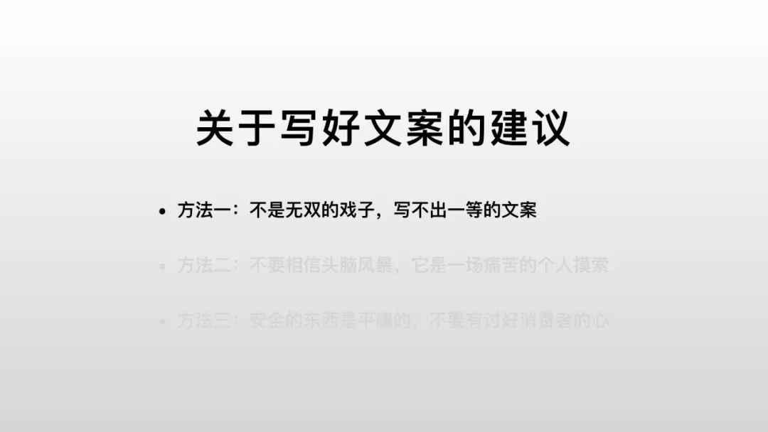 所以这次 HR 和一些同事建议我讲讲文案。但我肯定无意给大家讲什么基础的怎么写个标题如何写个软文如何定个广告语之类的。这次我打算讲讲顶级文案的样子。什么是顶级文案,我认为顶级文案都是解决人心问题的。