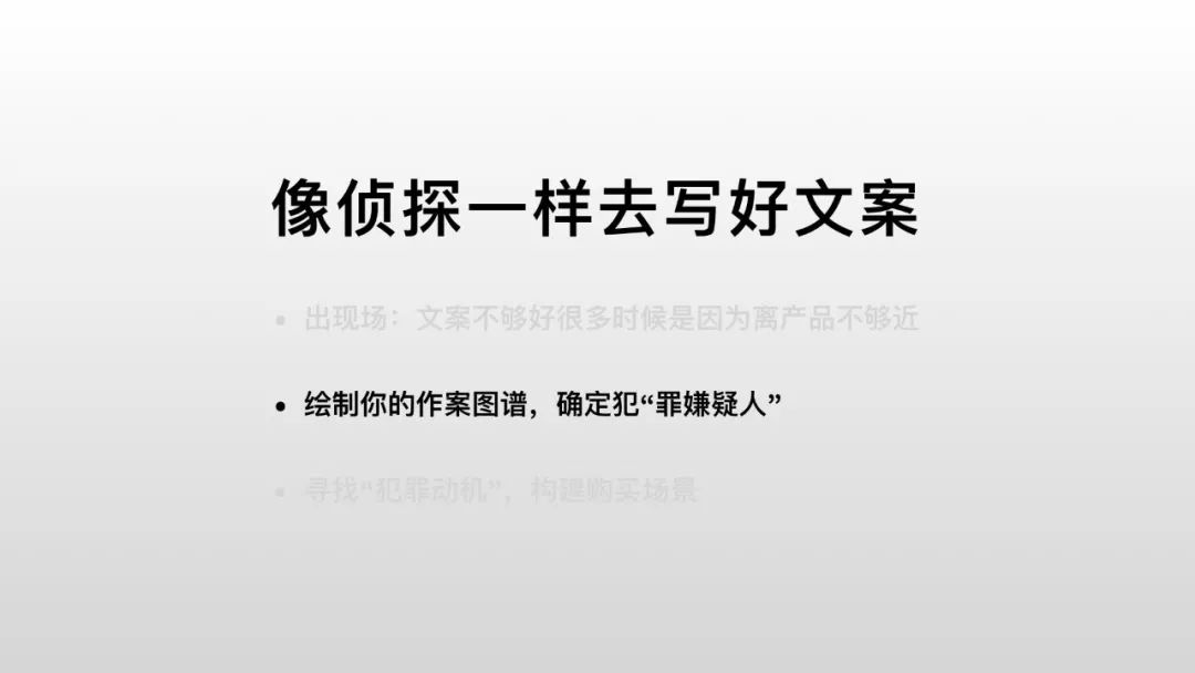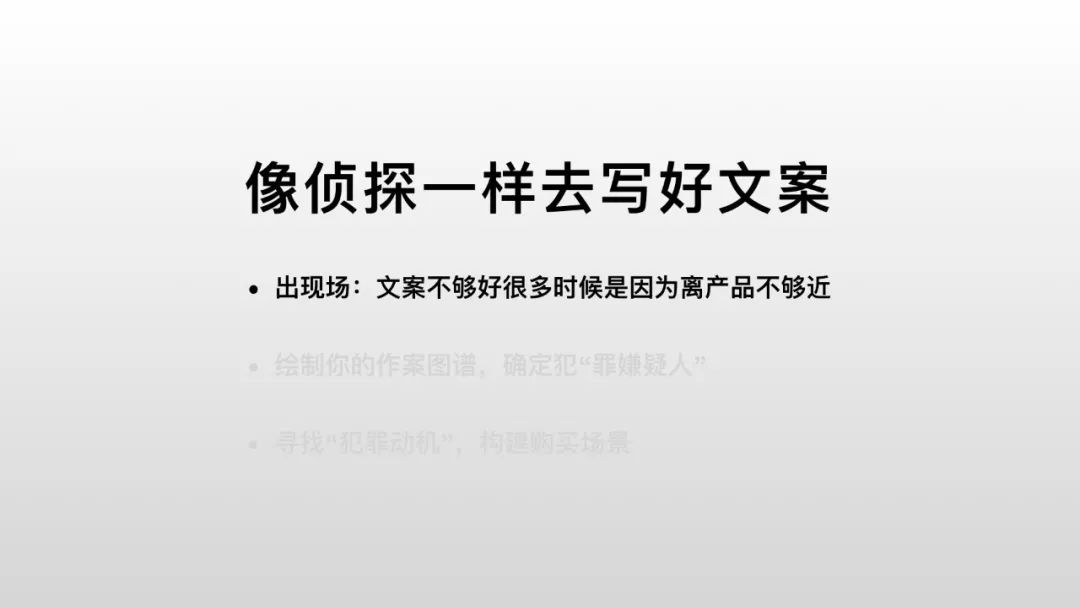 当然李教授有自己的方法论,我这里只是说我的理解,我觉得要写好这类文案你就应该把自己当成一个侦探,所以我经常跟大家说应该「像侦探一样去写文案]。