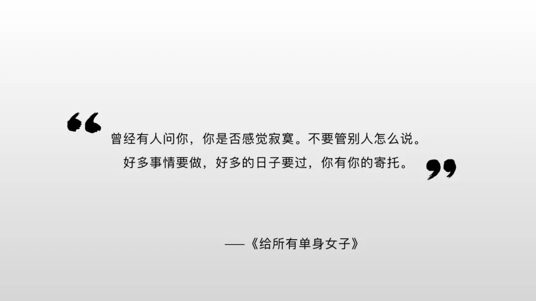 但很多人不觉得,他觉得你是一个单身女子,你就一定会寂寞。这不一定啊,很多人只是孤独,但不寂寞。好多的事要做,好多的日子要过,你有你的寄托,做点啥不好啊是吧,去喝咖啡,去撸猫,去健身,为什么单身女子就一定会寂寞?