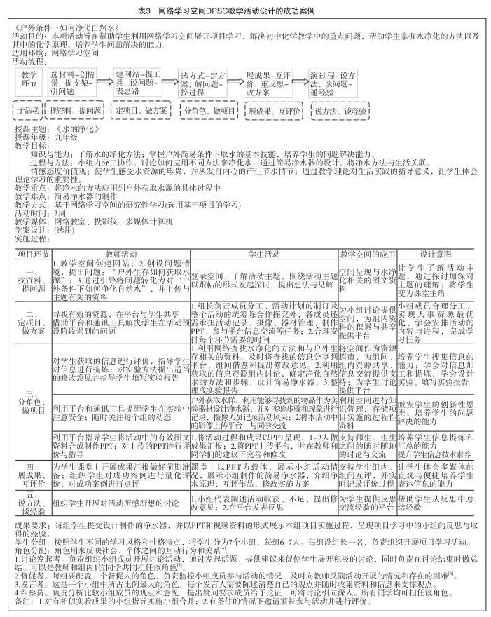 基于修订后的网络学习空间DPSC教学活动设计模板 [3] ,参与教学实验的教师设计完成了多项基于网络学习空间教学活动的设计方案。探索了网络学习空间环境下培养学生问题解决能力的教学活动设计方法,为二次修订模板提供了依据。下页表3为节选第二轮教学实验中化学课教学活动设计方案之一,以供参考。
