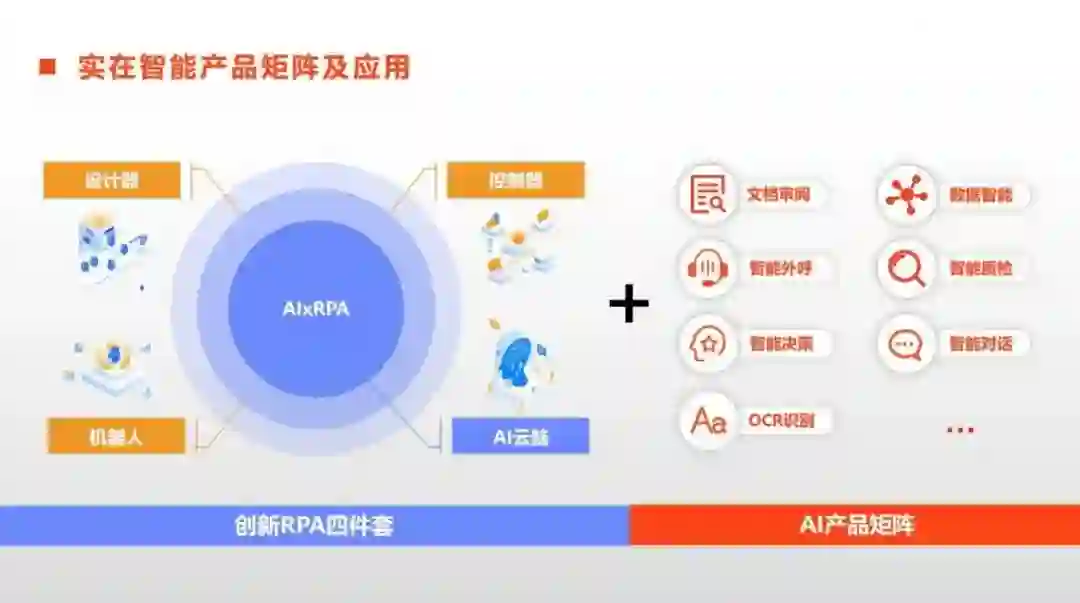 随着人工智能的兴起和发展,我们也发现传统 RPA 里其实有很多地方是可以和 AI 进行结合的,例如和语音技术、OCR 结合,这些是简单的加法。另一方面,RPA 技术本身存在一些瓶颈,例如我们要控制各种各样的软件,首先要识别这些软件里的东西,但是在识别上,我们是强依赖于操作系统底层的。这种情况使用传统技术就面临很多瓶颈,而 RPA 技术与 AI 结合可以获得较大突破。行业天花板被推升以后,与 AI 结合的 RPA 技术可以真正泛化到所有行业的软件上,并成为普适性的自动化技术。