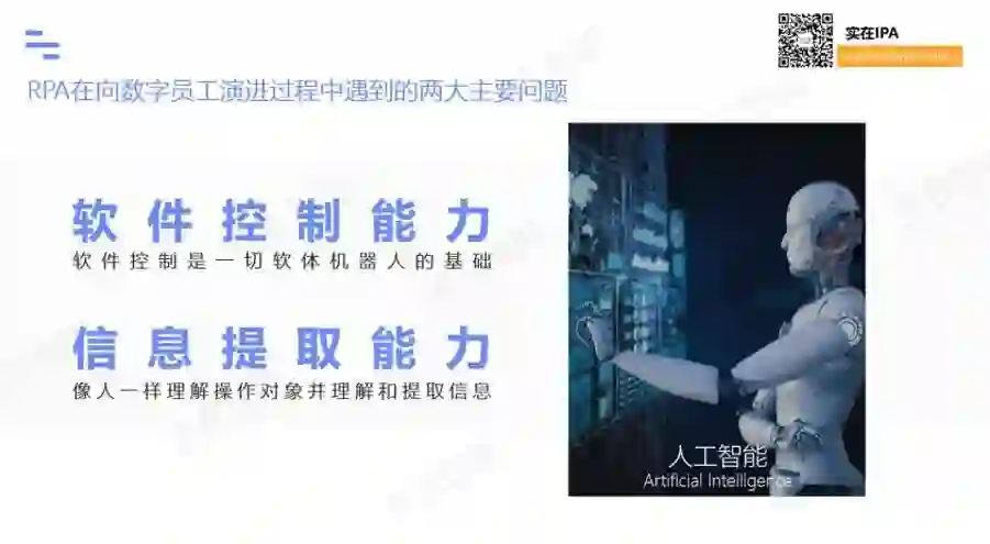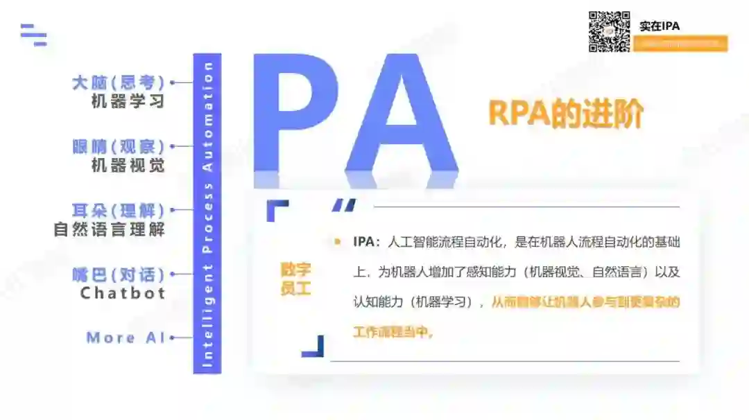RPA 本身有一些能力上的限制,我们要把它变成 IPA,结合 AI,好比人的眼耳口鼻和大脑,能够对话、理解、观察和思考,这才是真正的数字员工。