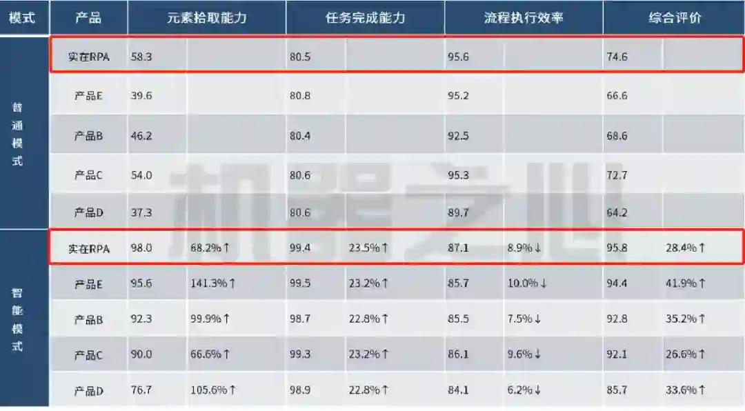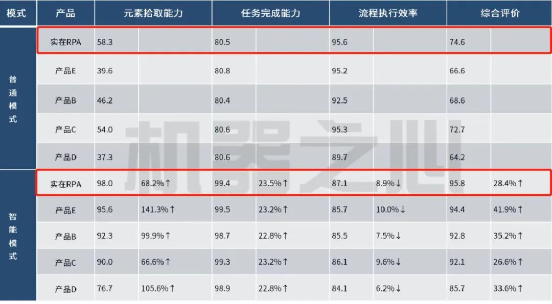 RPA 的瓶颈还远不止这些。例如在运行的稳定性方面,软件环境里有时会出现弹窗,而配置流程时没有预见到这个情况,流程可能就会被卡住,这种情况下我们需要系统能够自动识别到弹出了一个非常规的窗口,然后把它关掉,这样就有了辅助流程的概念。并且当按钮背后的 ID 发生变化时,或者说颜色发生了变化,系统还能以最大概率把它找出来,让流程运行下去,这个问题也要通过多种算法来解决。去年我们联合机器之心针对这个问题做了一个评测,在 360 软件库里随机抽取了一些软件,面向多个指标进行评测,结果表明我们在这项技术上是遥遥领先的。