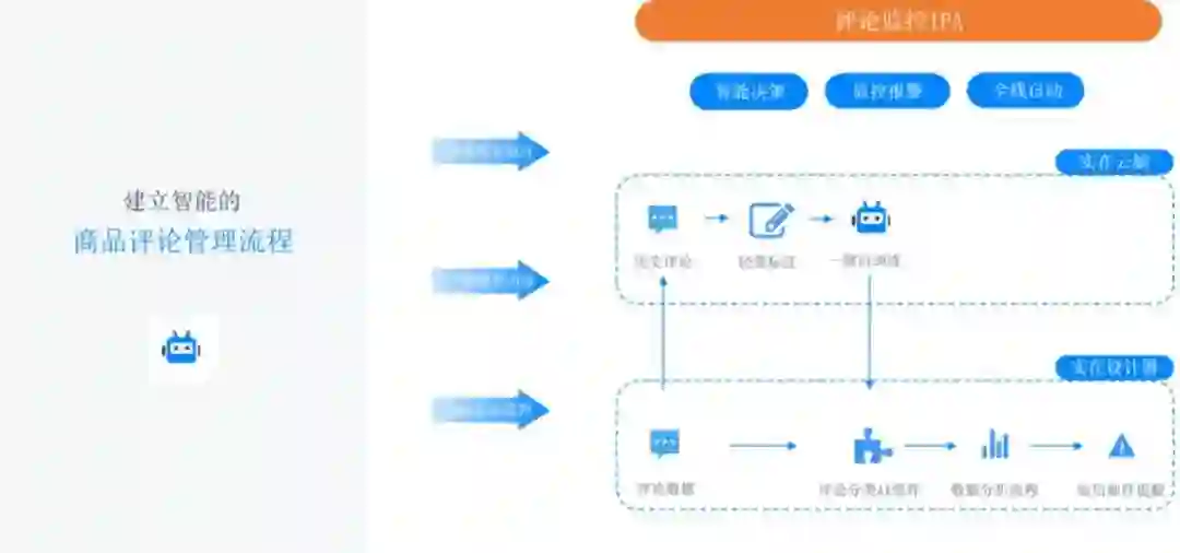 第二个客户是一个电商头部品牌客户,我们运用实在 RPA 技术把对于该客户的评论从多个平台里汇总出来,并通过智能决策的平台训练出模型,挖掘出里面隐藏的差评,通过差评分析反向对营销作出进一步的决策。实际上这是一个结合云脑和 RPA 做的智能评论分析场景。