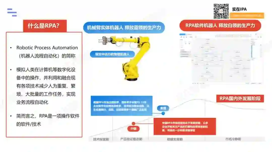RPA 全称叫机器人流程自动化(Robotic Process Automation)。举个简单的例子,工厂需要很多的自动化操作,机械臂可以很精准地完成一些规则化、重复的劳动。除了工厂,办公场景下自动化也有非常大的空间,智能化的出现让该领域得到了长足的发展。