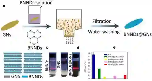 图1(a)BNNDs在石墨烯表面的沉积过程,(b)BNNDs@GNs复合片,(c)BNNDs及石墨烯的分散行为,(d)改性石墨烯聚合物涂层的屏蔽性