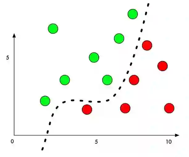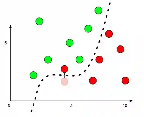 在原理上介绍对抗样本,以经典的二分类问题为例,机器学习模型通过在样本上训练,学习出一个分割平面,在分割平面的一侧的点都被识别为类别一,在分割平面的另外一侧的点都被识别为类别二。
