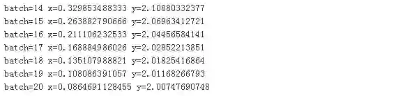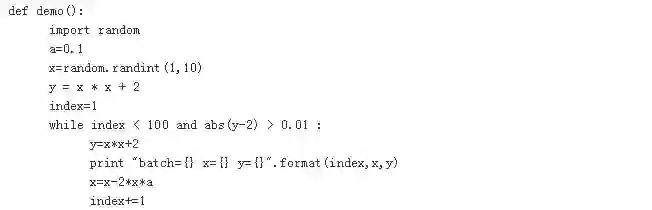 整个迭代过程最多100步,由于我们预先知道函数的最小值为2,所以如果当计算获得的函数值非常接近2,我们也可以提前退出迭代过程,比如绝对值相差不超过0.01。最后果然没让我们失望,在迭代20次后就找到了接近理论上的最小点。
