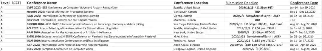 会议举办地、举办时间和征稿情况请参考下表(部分顶会未更新最新情况):