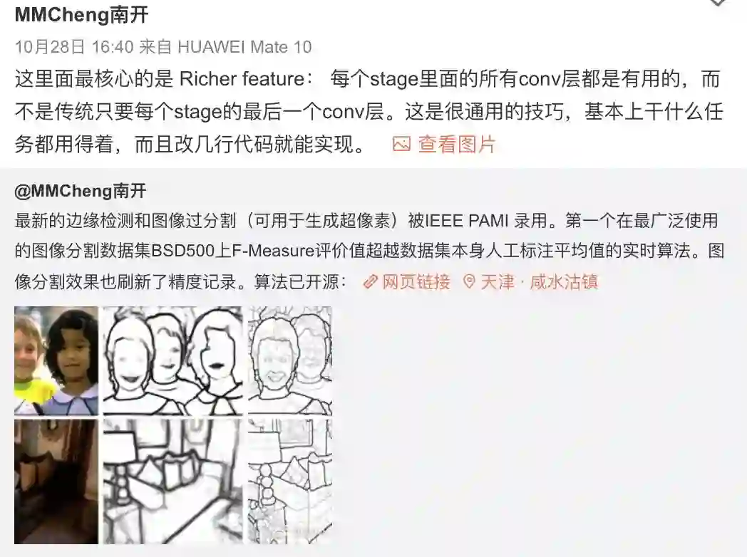 程明明老师在他的微博中分享说:”这里面最核心的是 Richer feature: 每个 stage 里面的所有 conv 层都是有用的,而不是传统只要每个 stage 的最后一个 conv 层。这是很通用的技巧,基本上干什么任务都用得着,而且改几行代码就能实现。“