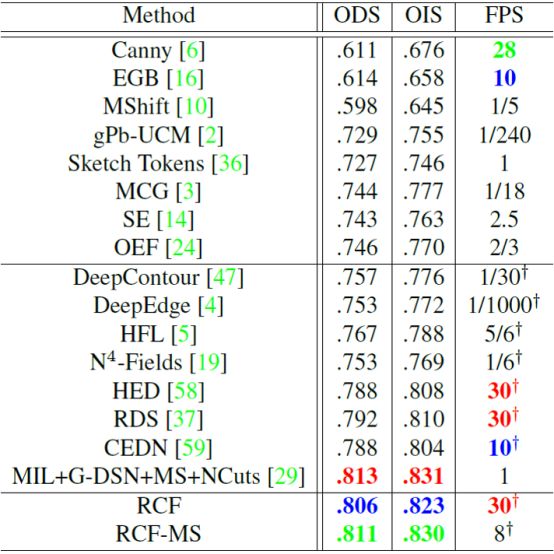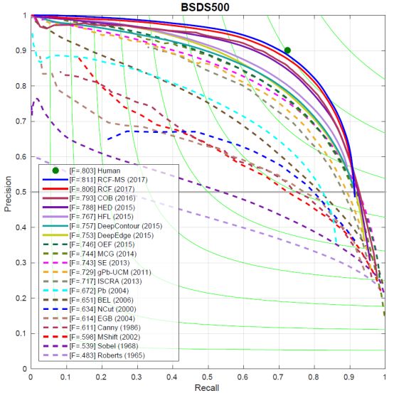 上图是超过 50 年的边缘检测方法性能总结。 我们的方法是第一个比人类注释器获得更好 F-Measure 分数的实时系统。