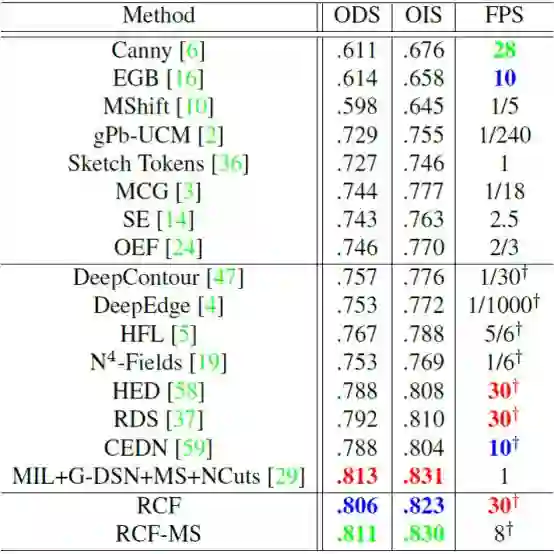 使用 VGG16 网络,我们的方法在几个公共数据集上有最好的性能(state-of-the-art)。在BSDS500基准数据集上进行测试评估时,F-Measure 分数(F-measure) 我们取得了 0.811 的成绩 ,并同时获得了8 FPS的速度。此外,快速版的 RCF 方法取得了 0.806 分和 30 FPS 的速度。为了证明所提出方法的多功能性,我们还将 RCF 检测的边缘应用于图像分割问题。