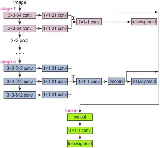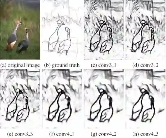 上图展示的是 RCF 网络架构。网络的输入是具有任意大小的图像,而网络的输出是具有相同大小的边缘检测图。我们将每个卷积层的层次特征组合成一个整体框架,而其中的所有参数都是可以训练学习的。由于 VGG16 中卷积层的感受野大小彼此不同,因此我们的网络可以学习多尺度,包括低尺度和对象级的信息,而这些信息将有助于边缘检测。