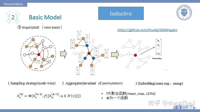 基于以上前两个两个比较致命的缺点,研究者使用空间域卷积来解决。空间域卷积的论文也比较多:DCNN(扩散卷积)、GraphSage、GAT(基于self-attention)、LGCN(邻居采样+top-k selection+ 1DCNN)等等,其实后面讲的模型都是空间域卷积,有比较有代表性的模型即GraphSAGE: