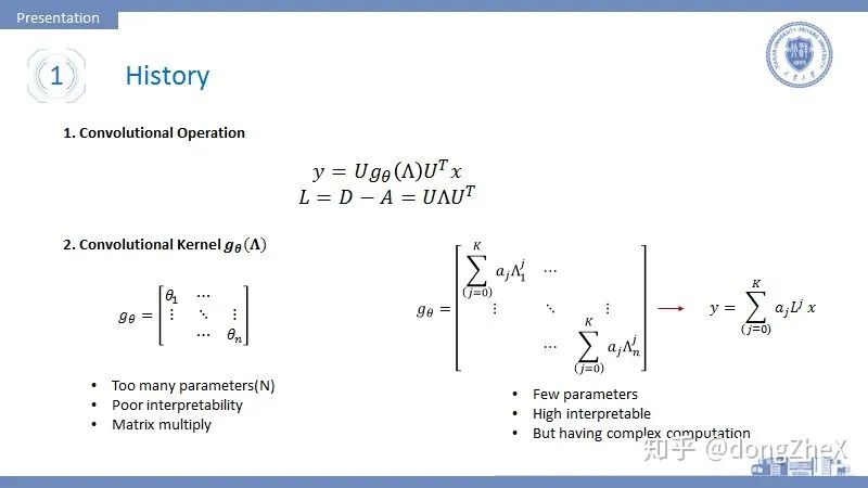 这是式子中,对于每个K只有一个参数,L的j次幂可以表示节点的j阶连通性,这也带来了较好的解释性:中心节点聚合其K阶邻居的信息,所以K可以理解为感受野,且参数数量等于K(一般K很小,例如K=2)。但是这个卷积核形式带来一些问题如:需要计算L的幂,造成了较高的计算复杂度。