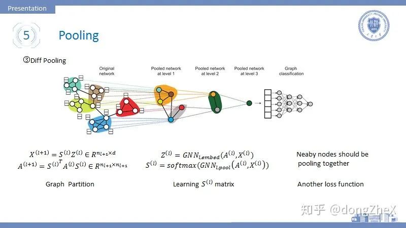 模型的思想是这样的,在模型的前向传播过程中,加入一个矩阵S,S的作用是将当前层的节点进行划分,划分后节点的数目减少,在网络的最后划分数目变为1。其计算过程如图14左侧所示,更加具体的操作细节,可以参考论文原文。