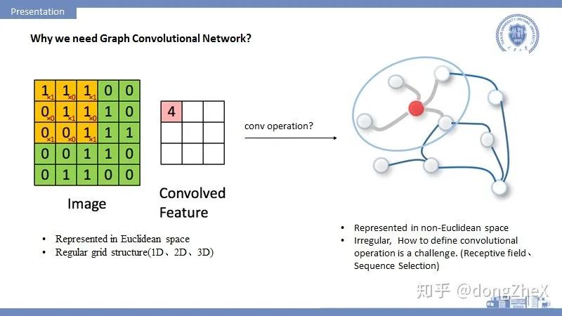 图结构数据的表示一般是不规则,传统的CNN等模型无法直接运用在图数据上,所以需要在图上重新定义卷积操作。其中要着重考虑感受野如何定义,节点的顺序性如何定义,如何进行池化操作等等,这方面大家可以参考论文论文[3],其中有比较详细的讨论。
