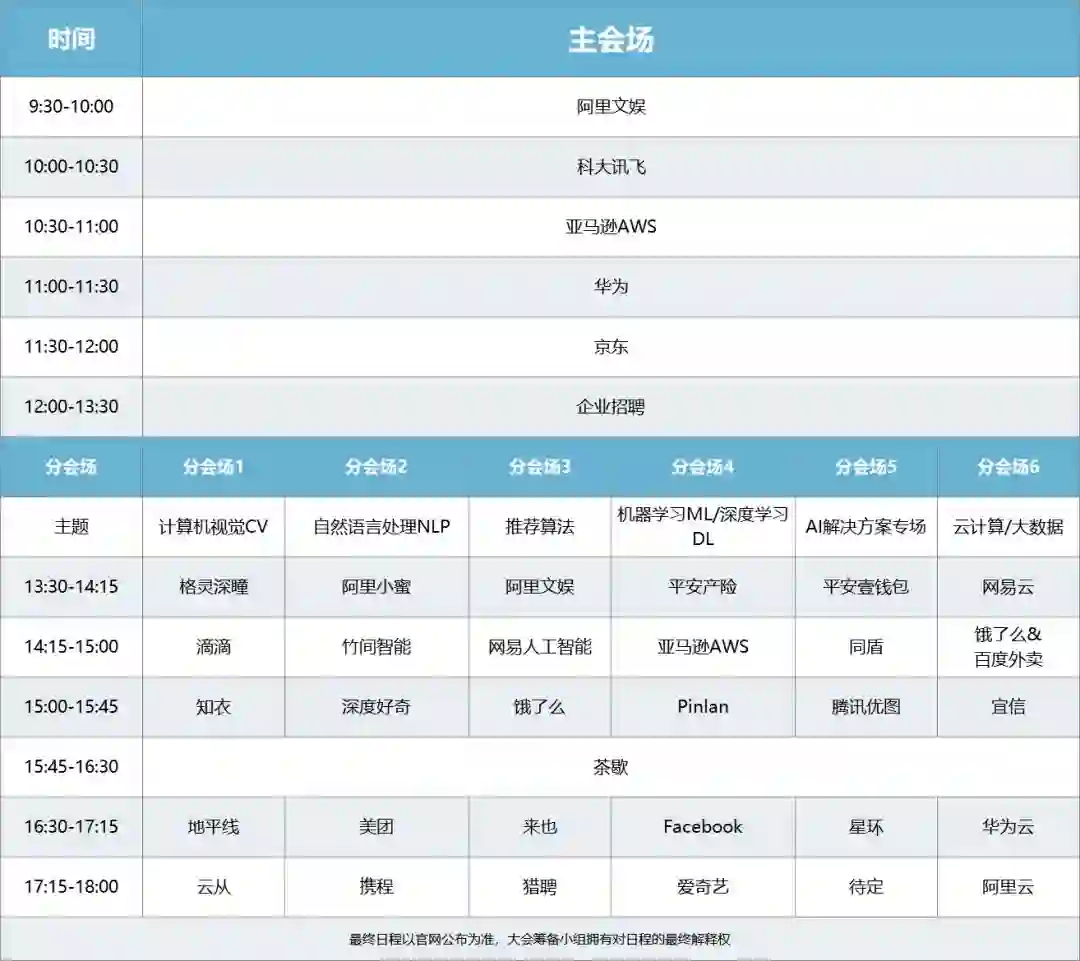 同时,我们开辟了 6 个分会场。主题分别为计算机视觉 CV、自然语言处理 NLP、推荐算法、机器学习 ML/深度学习 DL、AI 解决方案专场和云计算/大数据,来自腾讯、华为、网易等世界级人工智能专家,将垂直于技术领域进行分享,帮助 AI 商业落地。