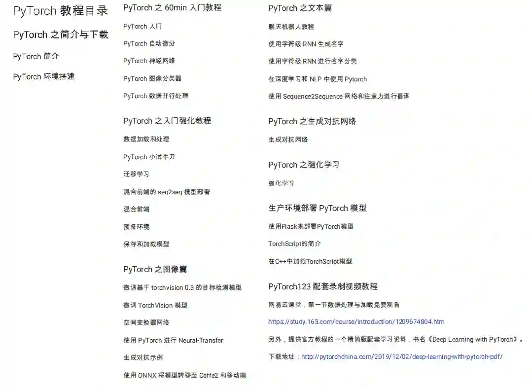 教程根据 PyTorch 官方版本目录,完整地还原了所有的内容。包括简单的环境搭建、快速入门相关 API、高级操作、图像处理实战、文本处理实战、GAN 和强化学习等,基本涵盖了目前所有深度学习相关的知识点。