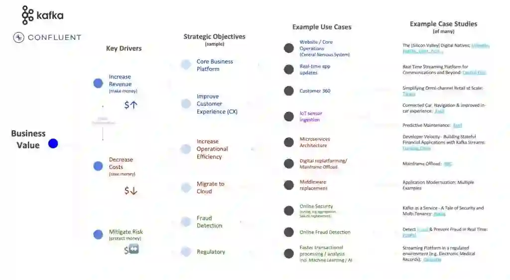 如果你还不能理解,可以就去看看各个行业的事件流用例,了解 Kafka 和传统的 iPaaS、MQ、ETL、ESB、API 工具之间的区别。下图虽然时间有点久但依然概括了大量的事件流用例: