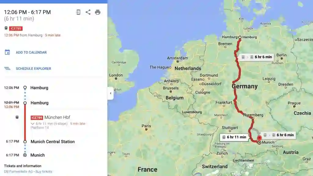 我们再来看看德国铁路公司。如前所述,他们的旅客信息平台是实时的。最近,德国铁路公司宣布与谷歌合作,与谷歌地图进行第三方集成。谷歌地图用户可以获得实时列车时刻表的更新信息: