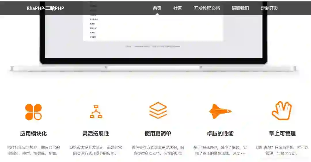 RhaPHP微信平台管理系统,支持多公众号管理,小程序开发,APP接口开发,平台独立且快速简洁易用。灵活的扩展应用机制,具有容易上手,几乎融合微信接口,简单的调用对二次开发与开发扩展应用模块大大提高开发效率,降低企业商家运营成本。扩展应用模块化,机制灵活,代码简单并快速上手。基于THINKPHP5强力内核驱动与LAYUI前端框架,支持 Linux/Windows/Mac。我们致力长期更新,永久免费开源!可捐赠,可定制开发(收费)。同样适合小白。