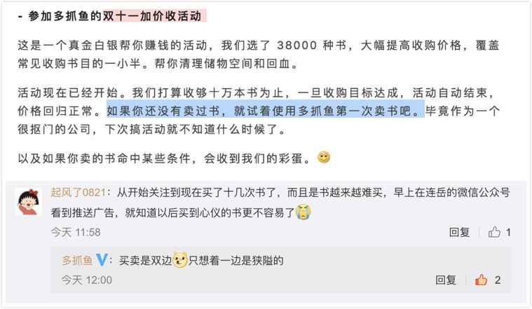 2017年11月中下旬,多抓鱼举办了“好书高价收,新书加价收”活动,不仅将原来最高3折的收书价格提高至5折,而且对于全新未拆封的书,比收购价多给一折的奖励金额,以此来刺激用户卖书给平台。