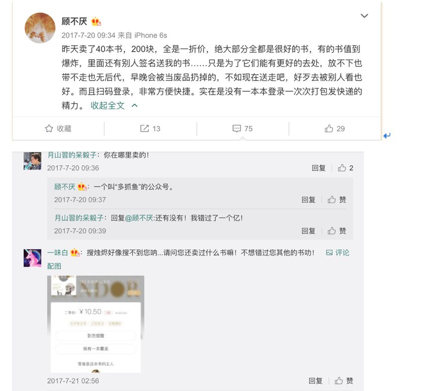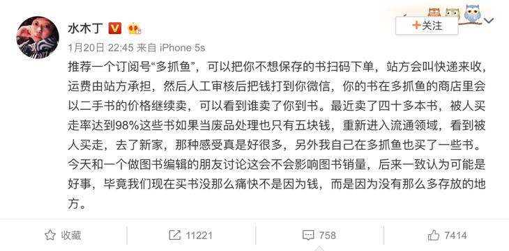 8月20日当天,紧随匡扶摇漫画的刷屏,拥有21万粉丝的大V麻宁在微博长文章中,借着“消费降级”的话题,提到了二手循环书店“多抓鱼”。