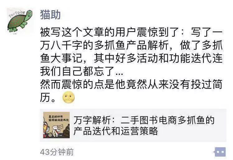 多抓鱼促进优质图书循环的愿景与一席倡导的人文关怀相契合,猫助对创业过程轻松诙谐叙述也有别于那些打了鸡血改变世界的陈词滥调,所以这篇演讲的文字版7月27日发布到微信后就在朋友圈刷屏,29号微博转发又加了一把火:
