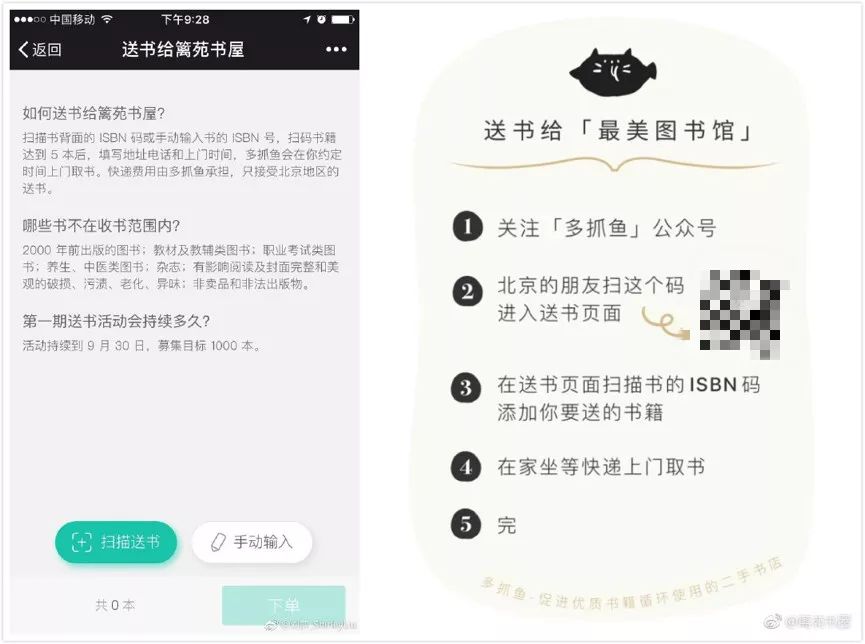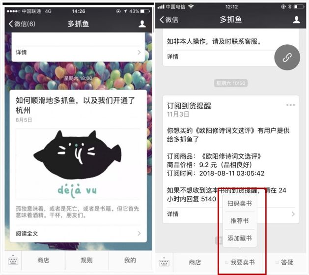 第二种很好理解,由线下引导到线上,卖书同时就会关注多抓鱼公众号,有助于早期用户积累;运营人员的现场示范能扩大传播,也起到教育用户的作用(扫码卖书毕竟是个新生事物)。