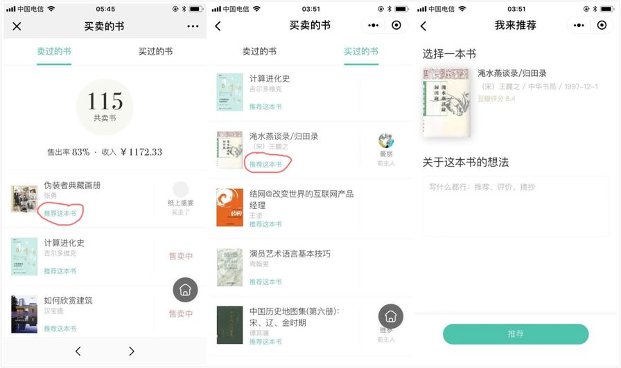 买卖图书列表每本书下面都增加了“推荐这本书”功能,引导用户对某本书发表评价、摘抄等类似于读书笔记一样的有意义内容。