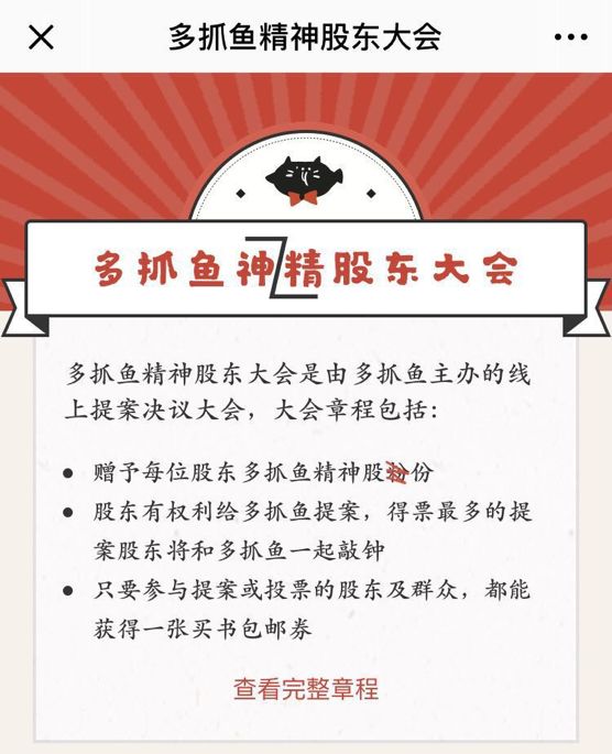 2018年5月初借着腾讯b轮融资,多抓鱼召开了“精神股东大会”,让用户通过在线“提案”的方式给多抓鱼提意见,也可以给好提案投票;针对那些呼声较高的提案,多抓鱼会优先实施。